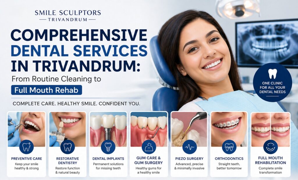 Discover comprehensive dental services in Trivandrum at Smile Sculptors, from routine cleanings to advanced treatments like dental implants, gum care, and full mouth rehabilitation, all designed to restore your smile and oral health.